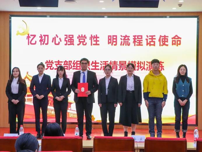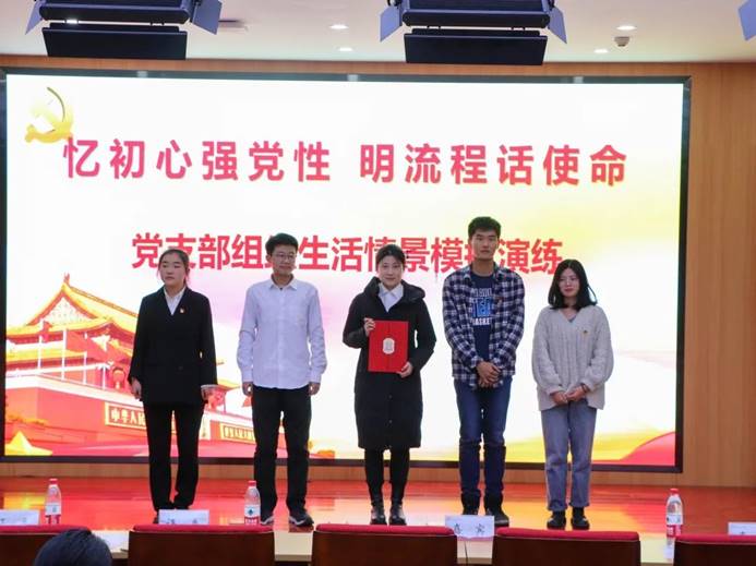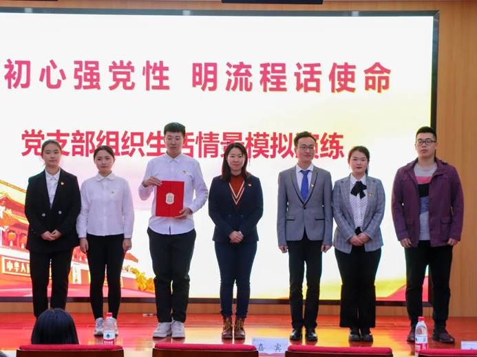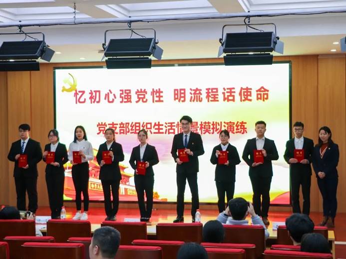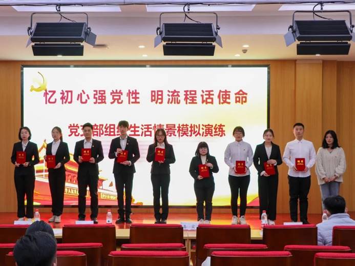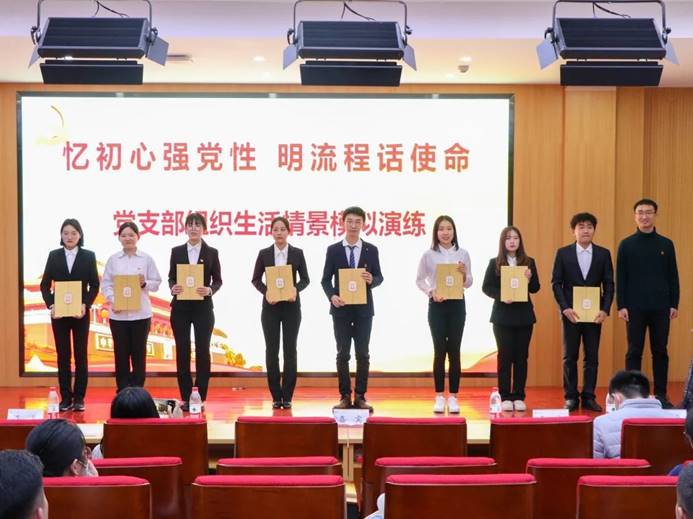 情景模拟的命题是由党总支老师们根据《中国共产党支部工作条例(试行)》,从平日发展党员工作的问题中提炼出的12个组织生活课题,每个党支部围绕主题,进行现场情景推演,为在座同学上了一堂别开生面的党课,使观众详细直观的了解了从提交入党申请到成为一名正式党员一系列正规的入党流程。