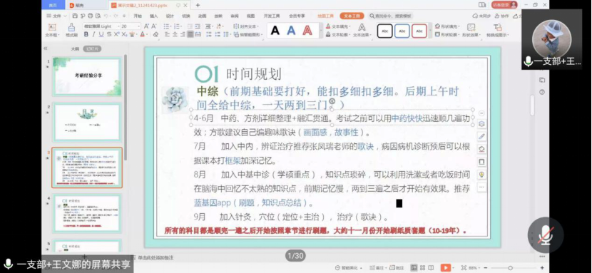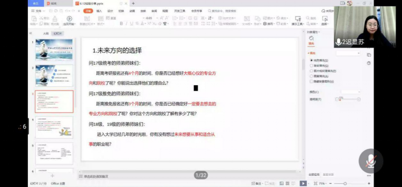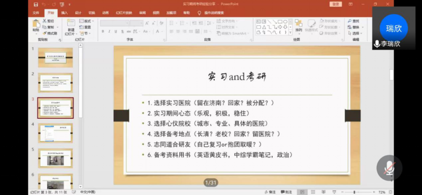 员工第一党支部的王文娜同学向同学们分享了考研的时间规划和学习建议。条理清晰、实用性强的分享对即将考研的同学帮助良多。员工第二党支部的迟显苏同学深入浅出地讲述了医学上对于未来规划的建议,对实习与保研、考研的关系处理作出了客观的解读——保研考研过程中都不能落下实习,她特别强调了热爱与合适的重要性,“海有舟可渡,山有路可行,此爱翻山海,山海皆可平。”李瑞欣同学分享了从实习到备考多个方面的实用经验,着重分析了如何平衡实习与考研之间的关系,使得同学们对考研备考有了更全面的认识。在互动环节中,三位优秀毕业生党员对同学们提出的在学习、生活中的疑惑进行细心答疑,使同学们坚定理想、共同进步。