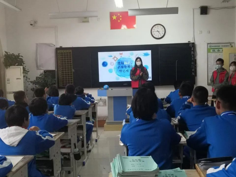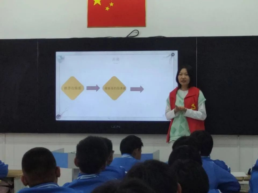 下午15:30,由工作人员带领志愿者们乘坐公交车到达目的地后,各组志愿者师哥师姐立即前往各班进行中医药以及卫生知识方面的宣讲。每班均设有三位志愿者,师哥师姐们采用新颖的讲课方式,为同学们讲述中医药知识。此次的授课课题为“霜降养生知多少,中医秋冬收藏法”。志愿者们积极认真备课,制作精美课件,以通俗易懂的形式向同学们介绍霜降养生知识,普及中医药文化。一张张多姿多彩的ppt ,一次次积极的互动,加上志愿者师哥师姐们有趣的宣讲与同学们默契的配合,让短短的一节课妙趣横生。
