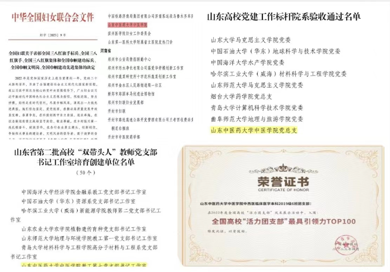 全年理论学习中心组学习12次;全年开展处级干部讲党课系列活动16次,支部书记讲党课50余次;党风廉政建设专题会议3次,意识形态专题会议3次;发展党员260名;“灯塔”e支部录入活动239次,参与率达97.6%;荣获2022年“全国巾帼文明岗”称号,获评山东高公司党建工作标杆院系、教工第七党支部书记工作室获评山东省第二批高校“双带头人”教师党支部书记工作室;2019级中西医临床本科6班获全国高校活力团支部;员工党员获国家级奖项112项,省级奖项111项,校级奖项1310项。