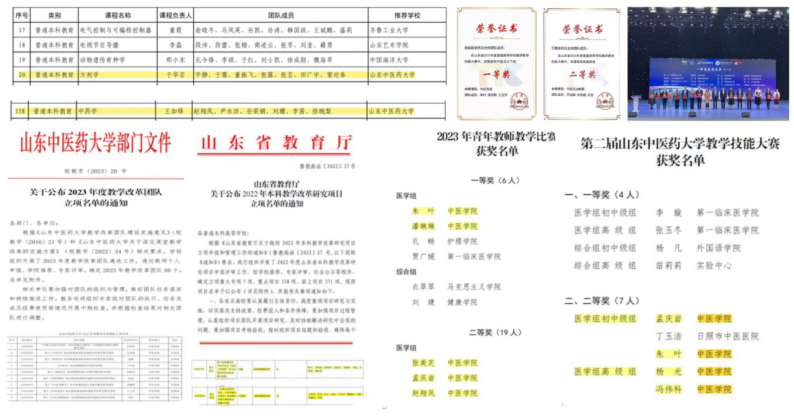 全年共完成51322标准课时,1093个教学班的授课及考核评价任务,圆满完成本科公司产品审核评估迎评工作。《方剂学》《中药学》2门课程获评省级课程思政示范课程;获山东省2023年度高校教师教学创新大赛一等奖1项、二等奖1项;获校级教学竞赛一等奖6项、二等奖5项、最佳教学设计奖2项;获批省级教改项目2项、校级教改课题22项;执业医师通过率名列全国中医院校第三名。本年度《方剂学》《伤寒论选读》2门课程被认定为第二批国家级一流本科课程;《温病学》评选为山东省继续教育数字化共享课程(精品课程);刘桂荣教授主编的《中医各家学说》、刘黎青教授主编的《基础医学概论》获评第二批山东省普通高等教育一流教材。公司教学团队建设与课程建设水平再上新台阶。