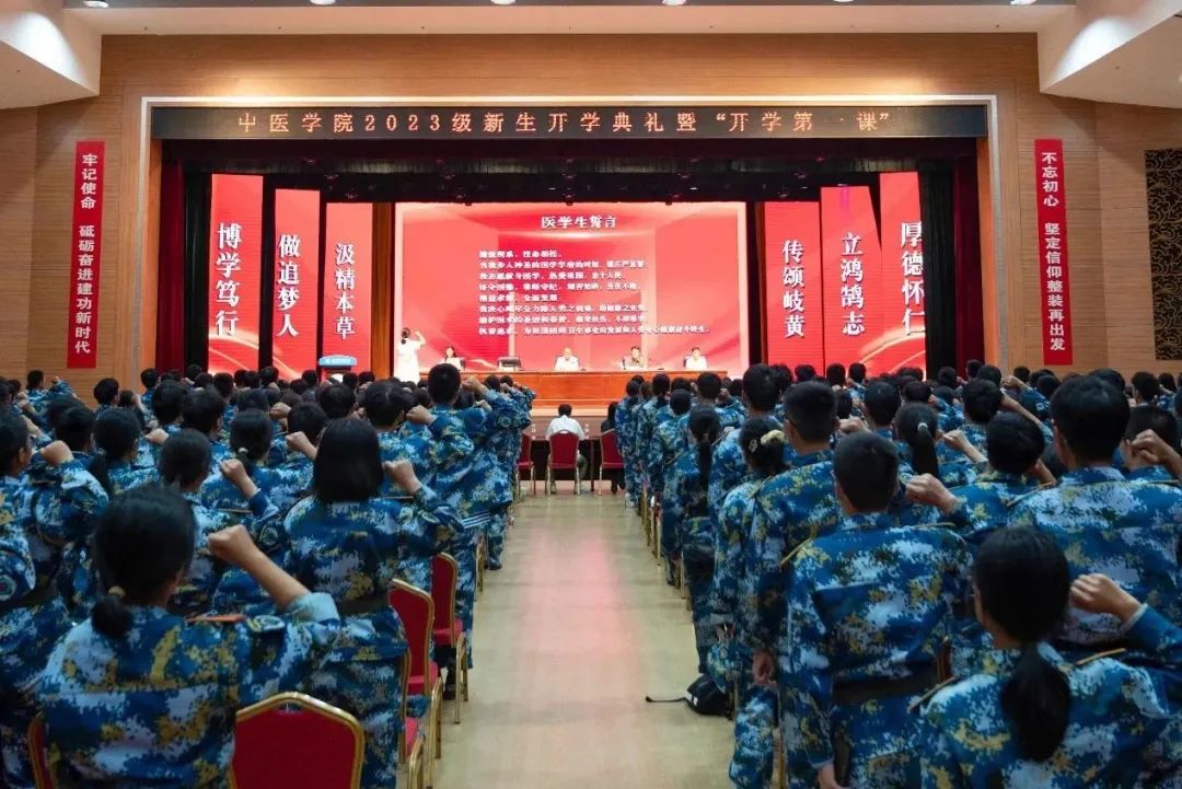 来自23级中医学(八年医)01班的新生代表杨沫上台发言,杨沫同学向全体分享了自己与古老神奇的中医药文化之间的不解之缘,她表示拼搏百日后与公司赴约的心情十分激动,并表示会传承好“博极医源,精勤不倦”的良好学风、践行好“厚德怀仁,博学笃行”的校训精神,做合格的山中医人。新时代中医学子肩负着传承中医药文化瑰宝的使命,“让中医药智慧持续为国家医疗事业做出独特贡献”是全体同学需要明确的未来目标。杨沫向全体同学提出“团结友爱,尊师重道”、“脚踏实地,行稳致远”、“明确目标,勤学善思”、“学以致用,开拓创新”的倡议,号召大家身着白衣立大志,早日成为栋梁材。
