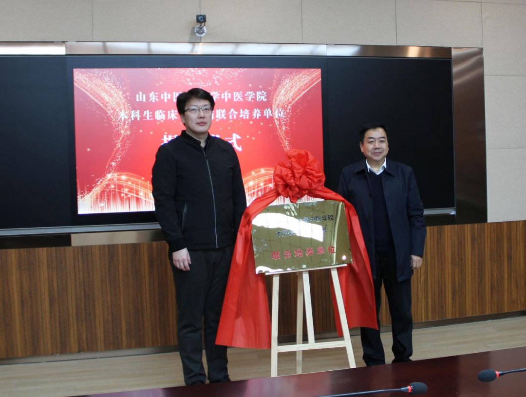 芦琳与兰陵县中医医公司党委书记孙梦寒共同为“太阳集团tcy8722本科生临床导师制联合培养单位”揭牌。
