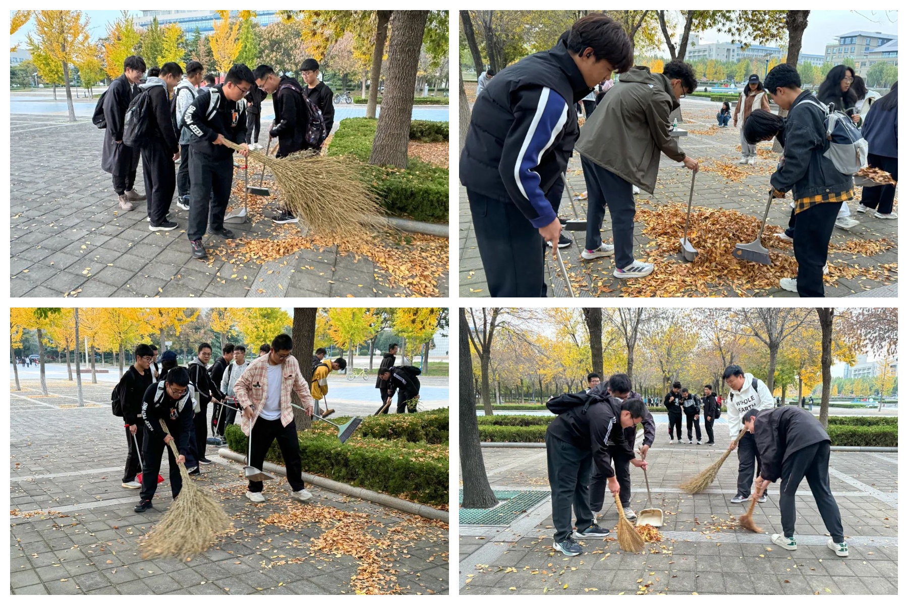 队员们分工明确,迅速行动。有的同学用扫帚清扫地面落叶等垃圾,有的同学拿着垃圾袋收集垃圾。在队员们的共同努力下,“十老园”旧貌换新颜。除此之外,同学们还对宿舍卫生区进行了常态化清扫。