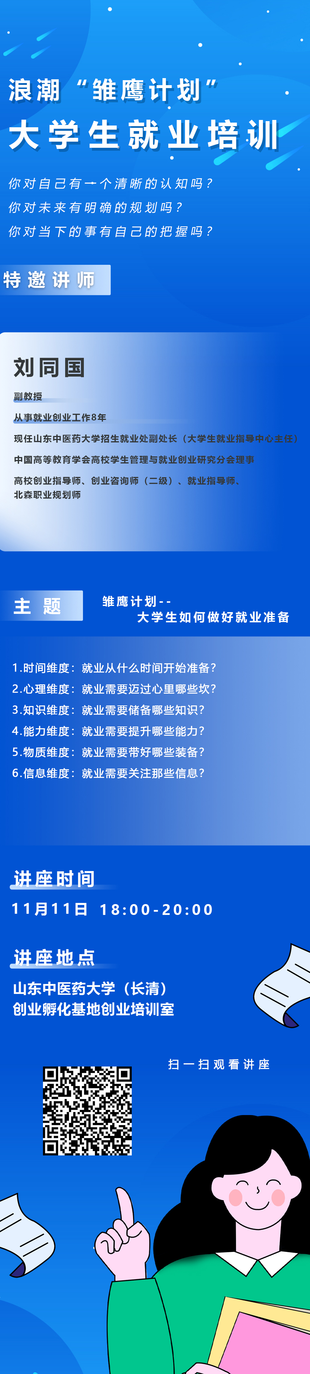 本次课程邀请公司老员工就业指导中心刘同国老师授课,从时间、心理、知识、能力、物质和信息等六个维度来指导大家做好就业准备,请大家扫描海报中的二维码观看。后续精彩培训,请大家继续关注“山中医智就业服务平台”或者“太阳集团tcy8722就业信息网——就业课堂”。