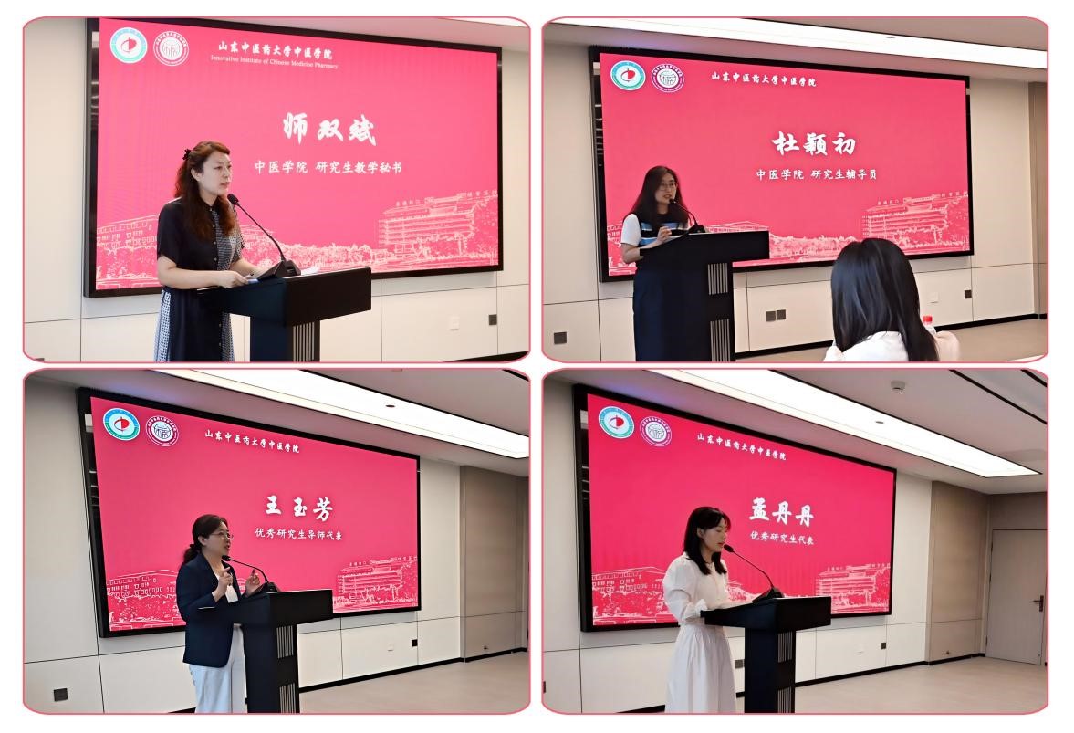 随后,研究生教学秘书师双斌对2025级公司产品方案进行了系统解读。研究生辅导员杜颖初重点讲解了公司规章制度与日常管理纪律,引导新生自觉遵守学术道德与校园规范。优秀研究生导师代表王玉芳教授在发言中分享了指导研究生的经验与感悟,并结合自身教学科研经历鼓励新生主动交流,稳步探索。优秀研究生代表孟丹丹分享心得,建议新生合理规划时间,深化中医药理论理解,成为传承与创新兼备的中医药人才。
