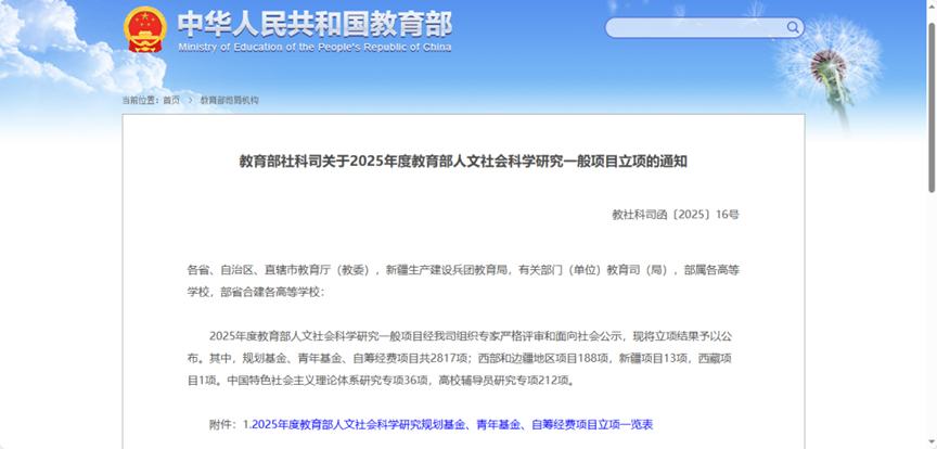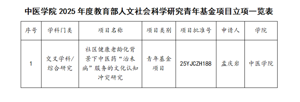12月2日,教育部社科司发布2025年度教育部人文社会科学研究一般项目立项的通知。公司教师孟庆岩主持的《社区健康老龄化背景下中医药“治未病”服务的文化认知冲突》获批青年基金项目,实现了公司在该类项目立项上“零的突破”。