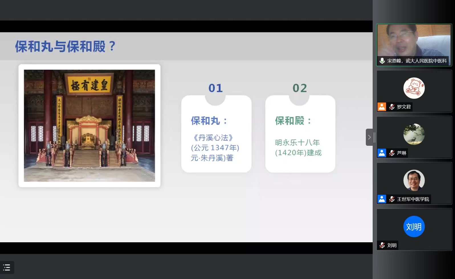 宋恩峰从中医药的特色与优势、中医学与中国文化、肺结节的概况、中医对肺结节的认识、从痰浊理论论治肺结节等几个方面,通过典型病例深入浅出地讲解了中医药在疾病诊疗中的独特优势,继而通过中医经典方药保和丸、交泰丸、坤宁丸与经典建筑保和殿、交泰殿、坤宁宫等进行类比解读,佐证了中医药与中国传统文化密不可分的关系——“中医药是中华文化的活化石”。宋恩峰还对肺结节的西医诊疗进展及中医病因病机、辨证分型、治则治法做了介绍。