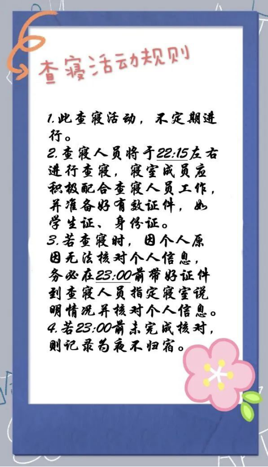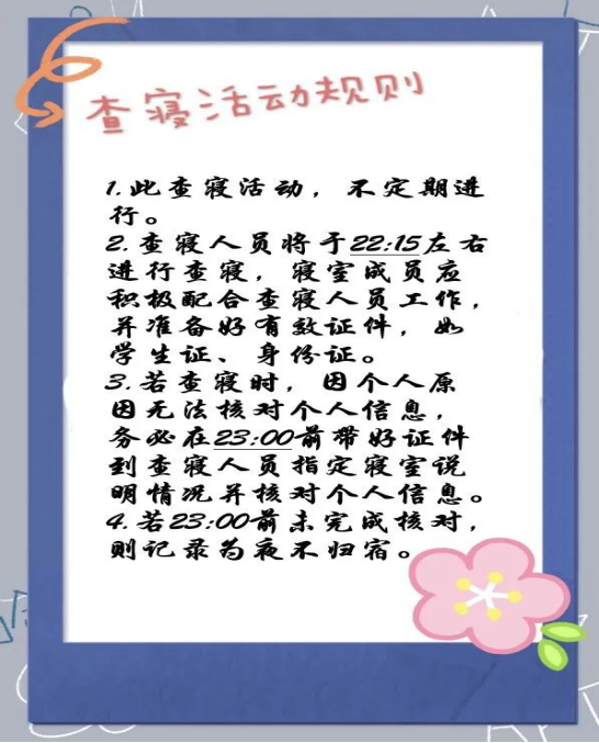 查课查寝人员拍了拍你说我们来啦。新的学期开始啦,为了给大家营造更浓厚的学习氛围,打造更舒适的宿舍环境,新一轮查课查寝工作即将开始啦!认真负责的我们精心准备了查课查寝规则,以便大家了解熟悉~