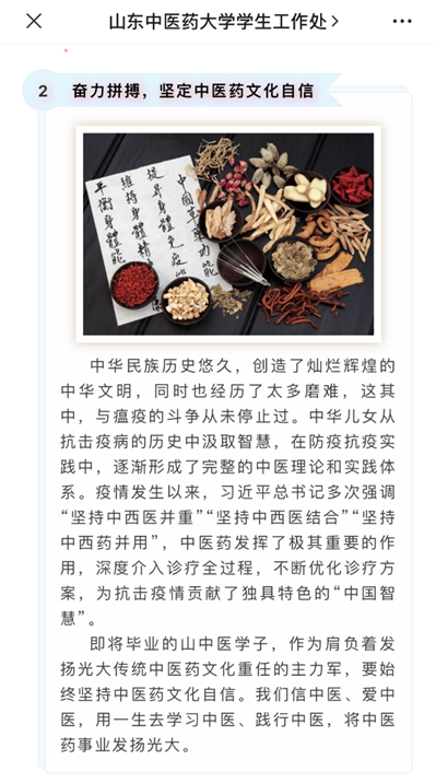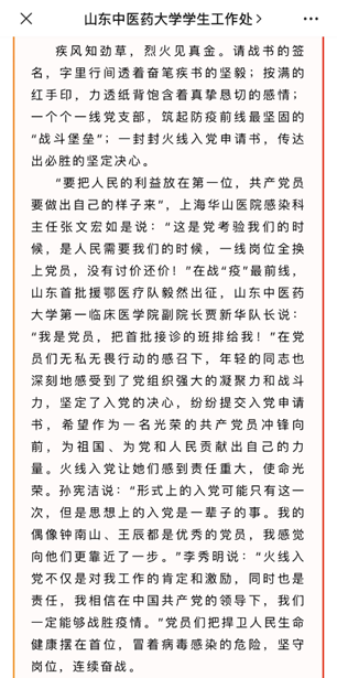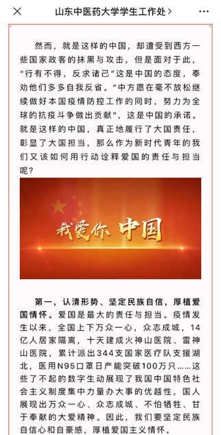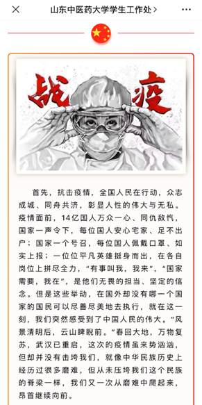 一场疫情,让我们见证了中国速度、中国实力、中国号召力、中国行动力,也让我们看到了大国的责任与担当,我们也更加深刻地感受到了身为中国人的幸运和自豪。作为新时代青年和医员工的我们,更应该认清形势、坚定民族自信,厚植爱国情怀;勤学修德、向上向善,增强使命担当;实干进取、甘于奉献,实践报国之行;积极入党,为祖国医学事业贡献力量,服务、奉献人民,成为担当民族复兴大任的时代新人!