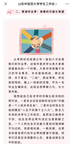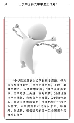疫情将假期拉长,转眼间就要到毕业季了,辅导员老师们不仅为毕业生们介绍了简历制作的相关知识,还帮助同学们明确目标与方向。老师们在文章中为考研初试通过即将进入复试的学子带来复试“干货”,希望同学们成功上岸;也为考研成绩不理想的同学们综合分析了各种选择,并提醒同学们要认真考虑自己的实际情况,调节好自己的情绪,避免意气用事。此次疫情为医员工就业带来了更大的机遇,目前线上招聘如火如荼,准备就业的学子们,要调整好心态,抓住机遇,准备一份加分的简历,祝福大家可以收获心仪的offer!