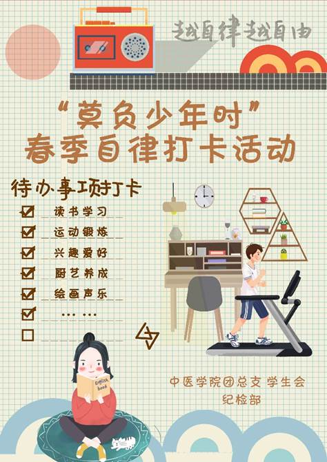 “四季莫负春光日,人生莫负少年时。”天色微明,我们开始诵读春天的诗句。少年是写满希望的字眼,描摹着世界的明天。为让当代中医学子养成每天学习锻炼、持之以恒的优良习惯,为丰富同学在家的课余生活,充分利用宅家时间,帮助同学养成每天学习锻炼的优良习惯,太阳集团tcy8722纪检部秉承着“厚德自律”的宗旨,特举办“莫负少年时”春季自律打卡活动。