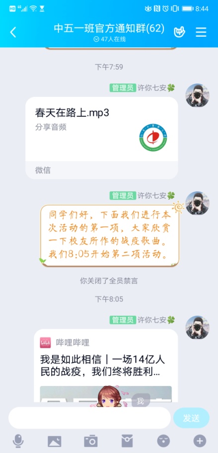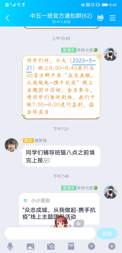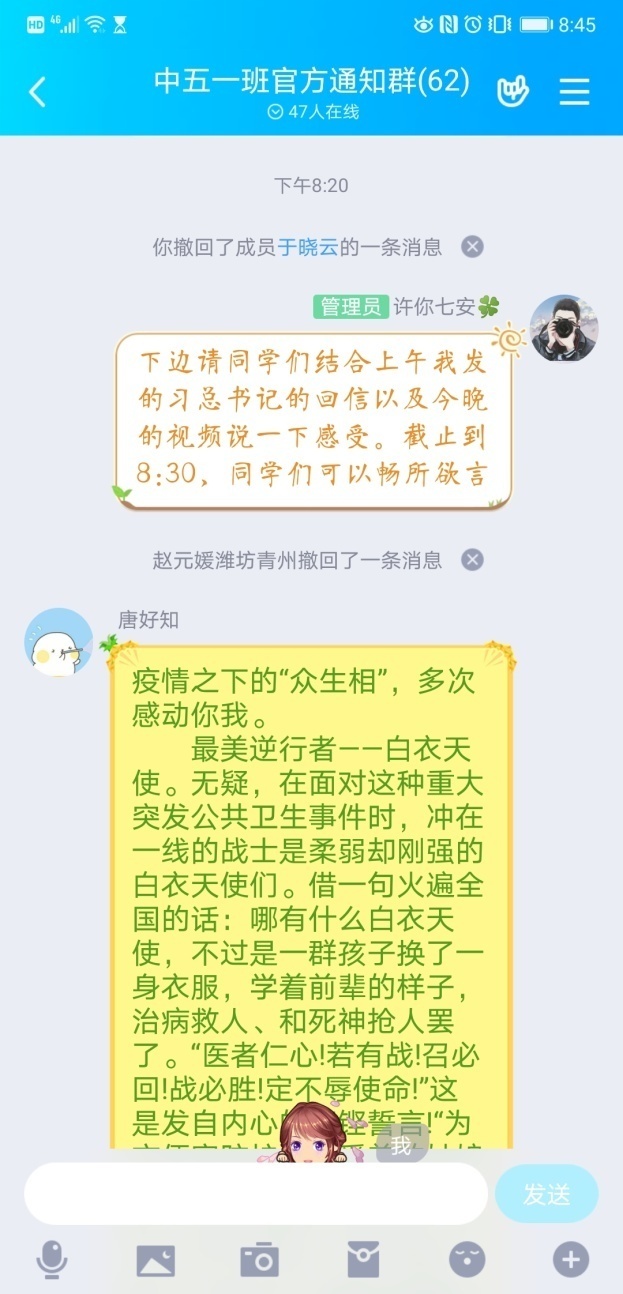 因为疫情,本支部首次采取线上的方式围绕“众志成城,从我做起”开展了这次特殊的主题团日活动,同学们都积极参与其中,配合团支部书记保证了活动的顺利开展。期间,同学们对此次疫情和奋战在抗疫前线的前辈们表现出了极大的关注和关心。