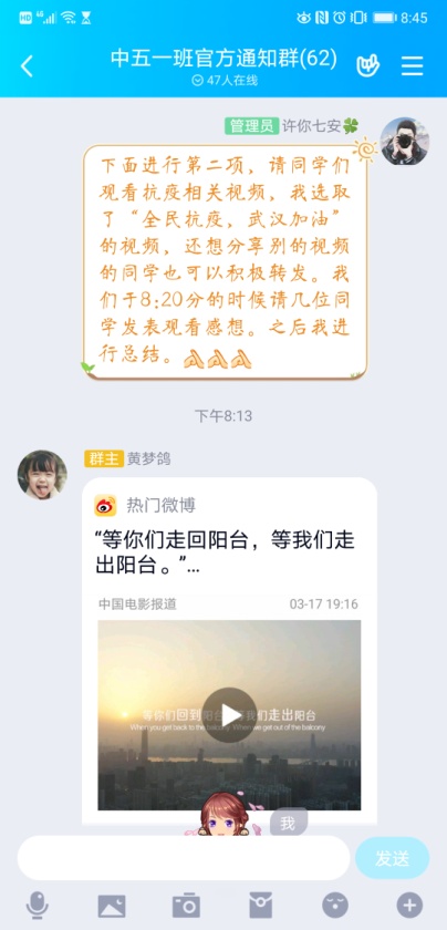 动听而又具有感染力的歌曲不禁深深鼓舞了每位同学,疫情期间在家中,我们并未懈怠,不忘初心,牢记使命,期待春风来,愿君安然返。