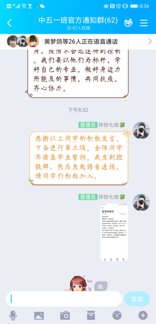 前期,为了积极宣传防疫抗疫活动,2016级中医学(五)01班团支部的团员们纷纷采取线上行动,及时关注疫情的相关报道,并带头鼓励家人做好自我隔离防疫,同时在家中“停课不停学”,每日通过辅导猫按时向公司报告健康监测,并积极主动学习相关专业知识以及习近平总书记的“回信”内容。