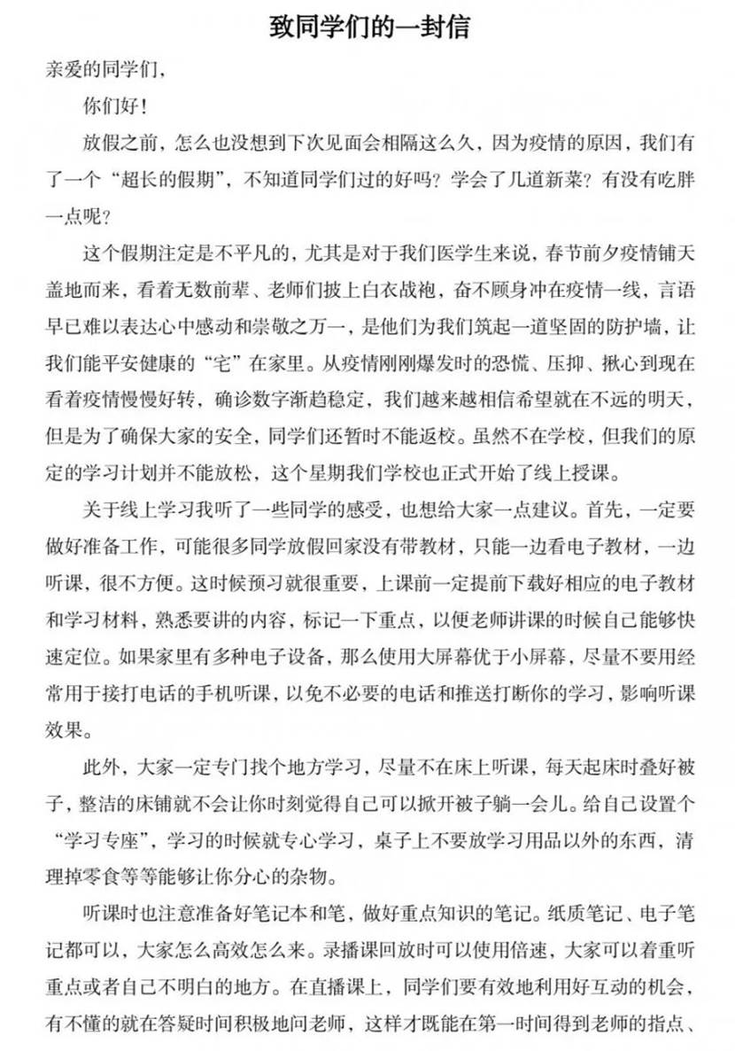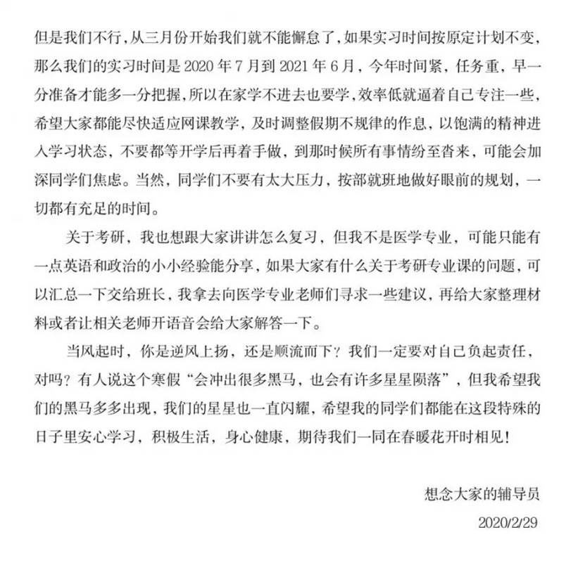 本次班会还有一份特殊的意义,通过班会的形式组织团员青年集中认真学习贯彻习近平总书记给在北京大学首钢医院实习的西藏大学医公司同学的回信精神,呼吁同学们发出中医声音,宣传中医正能量,表达公司、辅导员在疫情中对每一位同学的关心负责之举,增进大家之间的距离,让青春的号角汇聚成战胜疫情的力量,激发同学们的爱国爱党之情,爱校爱家之心。
