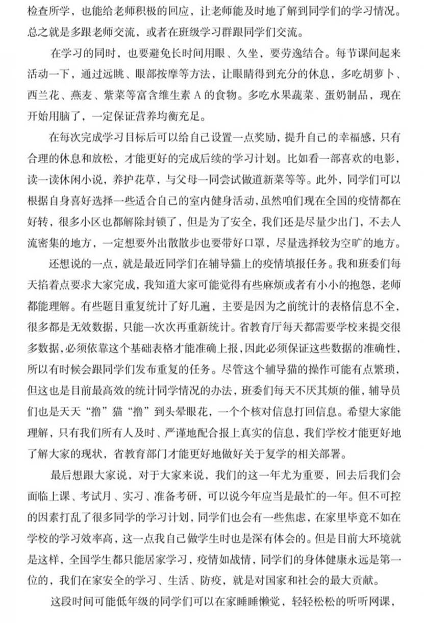 班会的特殊性不仅在于举办的时间与方式的特殊,还体现在形式的创新与拓展,传统班会是“导员讲,同学们听”的模式,而本次班会导员和我们每一位同学共同参与,互相交流生活感悟,采用问卷调查了解大家在学习生活上的疑惑,每个宿舍都派出代表进行自我分享,让大家在心理、思想和意识上都达到了共鸣,导员以书信的形式,用贴心的语言向大家表达了关心、要求和期盼,遵嘱我们要在疫情期间保持乐观积极心态,规律学习生活,希望我们每一个人都逆风上扬、静待花开,大家纷纷表示将更加积极配合公司及导员工作,上好每一次网课,填好每一次问卷收集,保护野生动物,加强自身防护,尽自己的微薄之力为战疫做出贡献。
