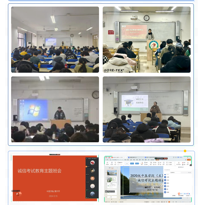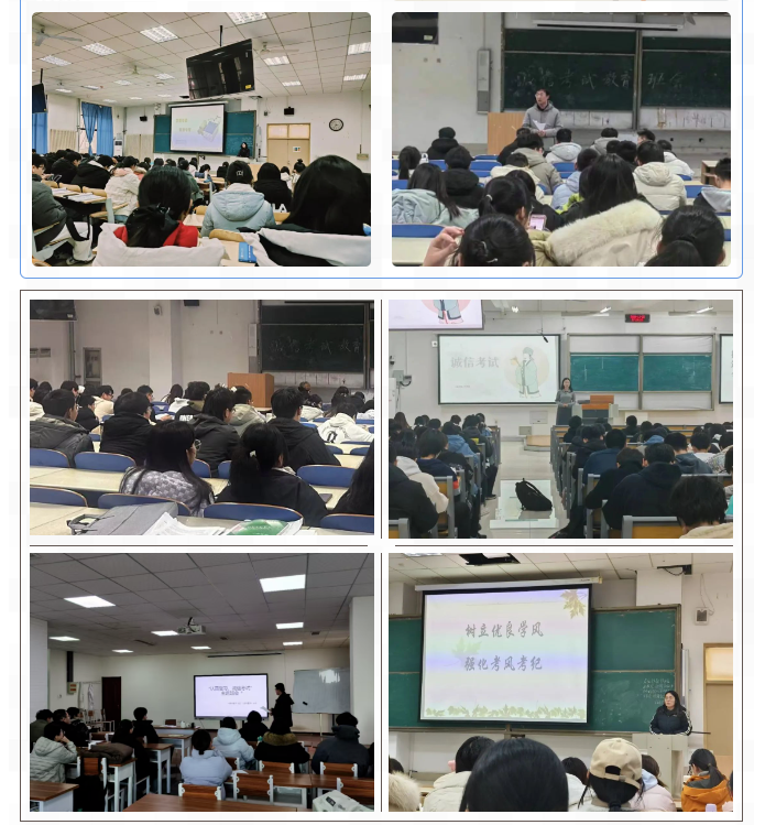 临近期末,考期将至,为持续抓好学风建设,塑造公平公正的考试环境,进一步帮助员工端正考试态度,提升诚信意识,太阳集团tcy8722于12月16日至24日期间,各专业班级陆续组织开展以“文明考风,诚信考试”为主题的教育班会,线上线下同步进行,全方位、多渠道地将诚信考试的理念传递给每一位同学。