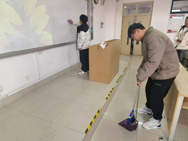 教学楼内,同学们以班级为单位分工协作。有人手持垃圾夹穿梭在课桌间,弯腰捡起地面散落的纸团;有人仔细擦拭白板,整理讲桌上的物品;还有人逐一检查座位,将同学们遗落的水瓶、废纸等垃圾统一回收。