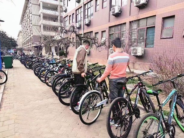 宿舍区同样热火朝天,同学们重点清扫卫生区路面垃圾,捡拾绿化带中的塑料袋、枯枝落叶,并对卫生区内随意停放的自行车进行规范摆放。大家默契配合,将散落的单车移至指定停放点,车身歪斜的车辆逐一扶正,让原本杂乱的通道变得整齐有序,清扫过后,教室讲台无尘、白板光洁,宿舍卫生区路面清爽、车辆成线,春日校园更显清新活力。