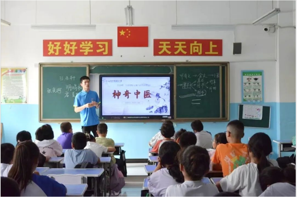 还记得支教第一天,我选择了最有把握的中医基础理论课作为我的开场课。走进教室,我看到的是一张张稚嫩的脸庞,他们天真活泼,眼神中充满了对知识的渴望。我本以为这节课能够顺利地进行下去,但事与愿违,孩子们薄弱的中医基础让我精心策划的课程在进行中遇到了困难。为了讲课的顺利开展,我不得不让自己的语言尽量做到生动有趣,同时尽可能从众所周知的知识出发,将枯燥乏味的中医药知识同多姿多彩的日常生活相结合,鼓励同学们勇敢表达。虽然后面的课堂氛围不再像刚开始那般乏味死寂,但是一天的课下来,疲惫的身体和彷佛被戈壁上细沙磨砺过的嗓子让我意识到原来讲课是对意志和身体的双重考验,身体上的不适让我一度感到忧虑和迷茫,甚至开始怀疑自己的选择是否正确。