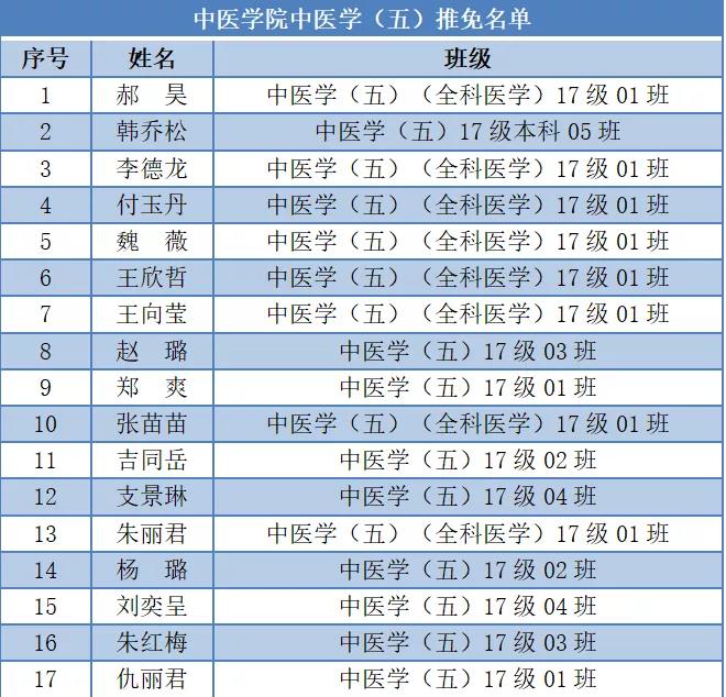 经员工申请、院系审评、校内公示,太阳集团tcy8722中医学(五)专业共17名员工获推免资格。
