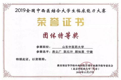 2019年首届中西医结合老员工临床能力大赛中,公司2015级中西医临床医学专业房立广、宁婕和2016级中西医临床医学专业顾知恩、阮梽珅四名同学组成的代表队夺得全国总冠军,获得特等奖。其中房立广和顾知恩两位同学分别在针灸推拿和中医诊断项目中成绩位列第一,获个人单项奖。