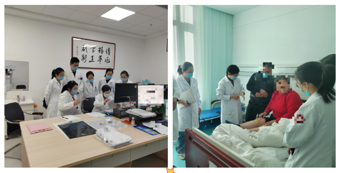 这是一个有双下肢水肿并且难以站立的患者,经过几天治疗效果一般。因此,邀请来专家会诊。左边这张照片是专家老师在看病历并且分析病情,最后给出接下来的治疗方案,其他老师在旁边听讲以及吸取经验。右边这张照片是专家老师去病房查看患者。通过与患者的交流,了解患者现在的身体状况,并进一步完善治疗方案。
