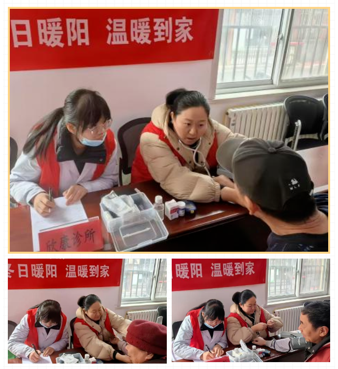 此图组为寒假临床导师制期间由指导老师带领参与义诊活动。值此相遇,三冬觉暖。在与来访者的沟通中,令人印象深刻的是一位血压高却不注意控制的患者,和一位迷信保健品拖延病情的患者。在老师对来访者们的耐心劝说下,本人意识到中医深入基层的意义——健康源自于生活,疾病是一点一滴的恶习积累起来的,从源头出发,除病灶甚至是治未病都是事半功倍的。不仅如此,本人还于此次活动中学习了医患沟通的技巧以及简单的诊断治疗技术。这样的活动不仅普及健康知识,更能体现医者的社会责任感。正如此次活动标语所说“冬日暖阳,温暖到家”,把健康带到千家万户,是医者义不容辞的使命!